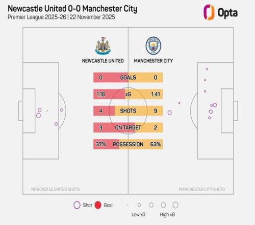 北京时间11月23日,在英超第12轮的一场强强对话中,纽卡斯尔联和曼城在上半场浪费多次得分良机之后,前45分钟0-0互交白卷。